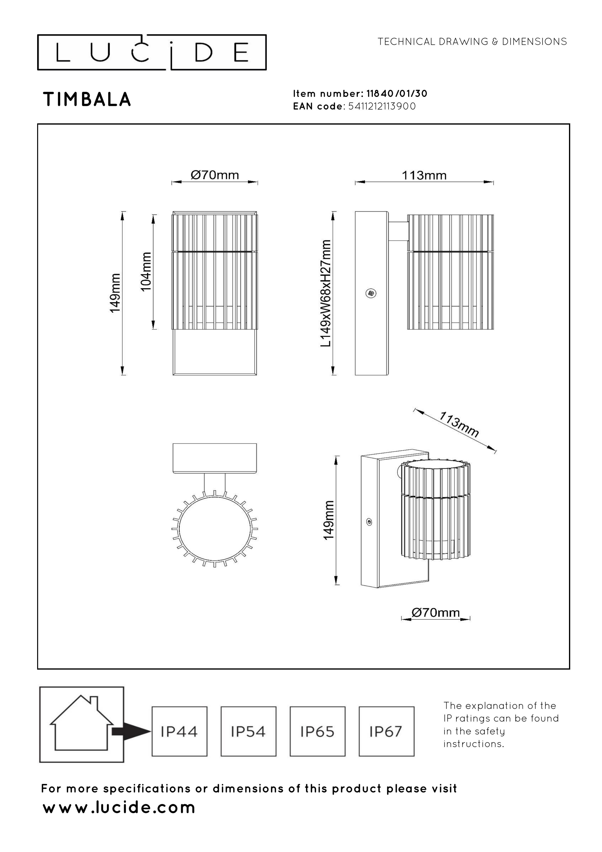 Strak, betrouwbaar en stijlvol, de Lucide TIMBALA is een veelzijdige wandlamp voor buiten die perfect aansluit bij moderne gevels, tuinmuren of entreepartijen. Deze compacte wandspot is vervaardigd uit hoogwaardig aluminium met een zwarte, matte poedercoating en biedt downlight-verlichting via een GU10-fitting (max. 40W, dimbaar via externe dimmer). Dankzij de IP44-classificatie is TIMBALA bestand tegen regen en vocht, waardoor hij uitermate geschikt is voor langdurig gebruik buitenshuis. Met een breedte van 7 cm, een diepte van 11,3 cm en een hoogte van 14,9 cm combineert deze spot efficiëntie met elegantie. Kies voor functioneel buitenlicht met een minimalistisch design.