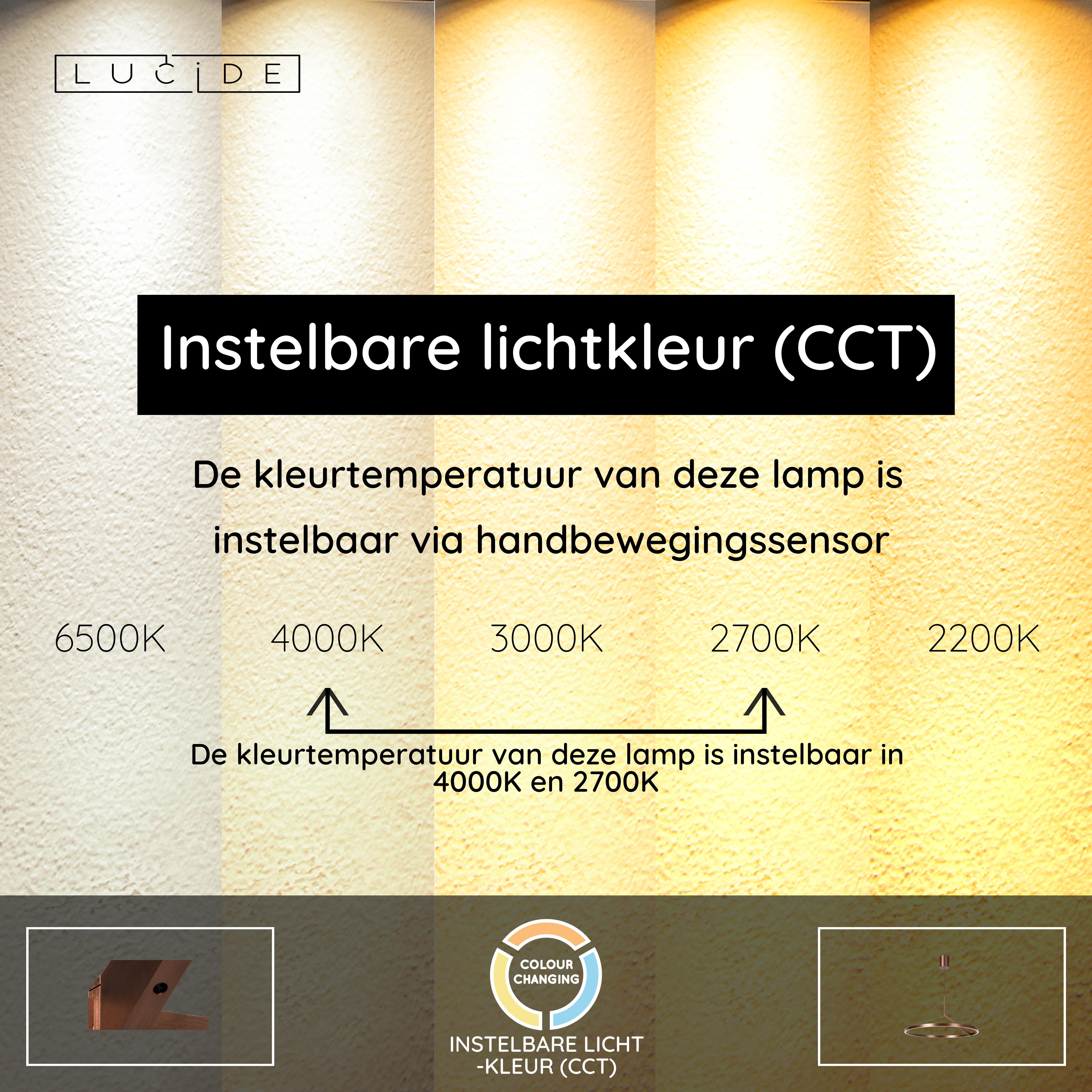 - Kleurtemperatuur instelbaar via handbewegingssensor (2700K-4000K)