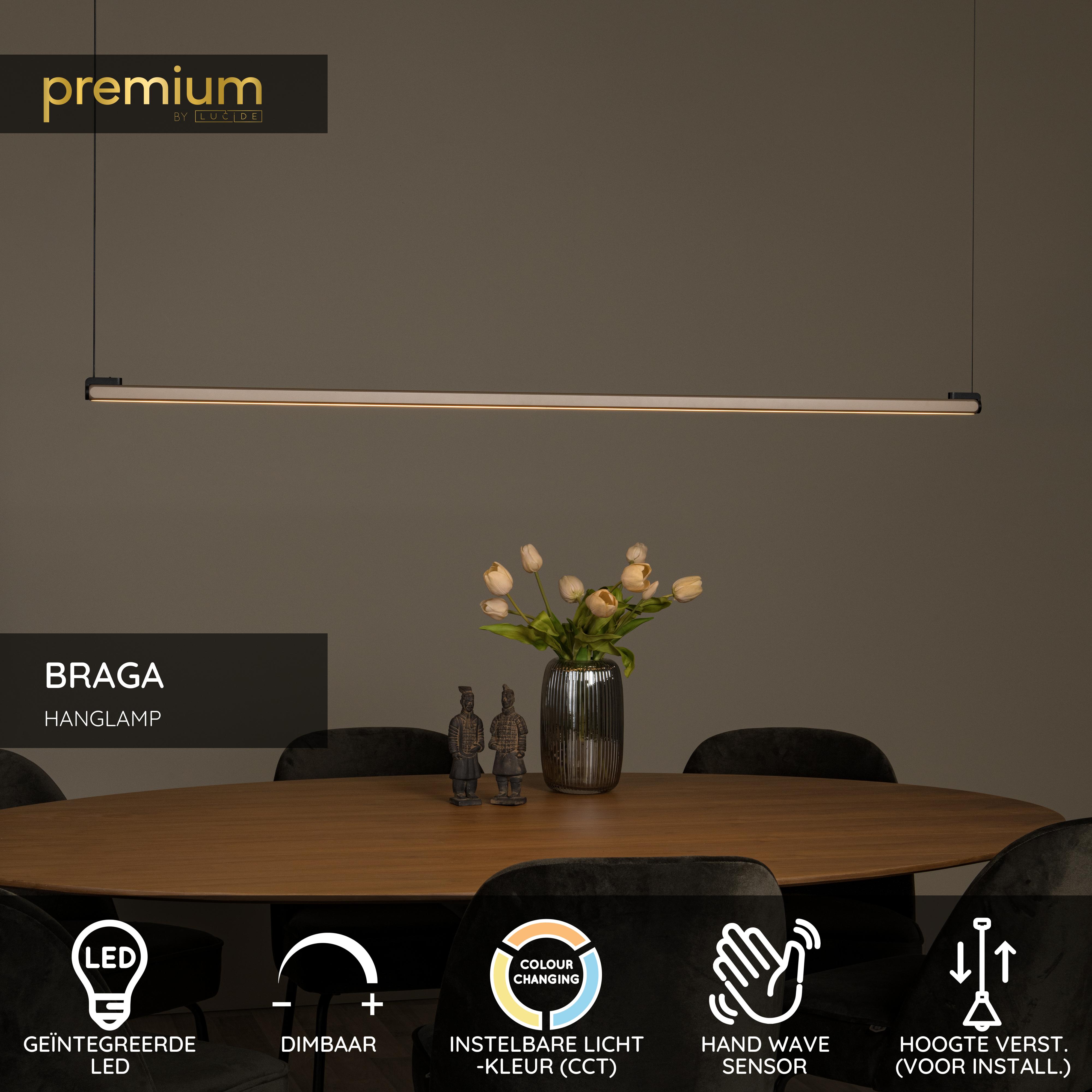 Voeg een vleugje luxe toe aan je interieur met de Lucide BRAGA hanglamp uit de Premium collectie. Deze moderne en stijlvolle hanglamp is vervaardigd uit hoogwaardig aluminium en heeft een elegante koffiebruine afwerking. Met zijn strakke rechthoekige design en geïntegreerde LED-verlichting biedt BRAGA een subtiele maar indrukwekkende lichtbron voor eetkamers, keukens of woonkamers. Dankzij de handwave sensor, instelbare kleurtemperatuur (2700K-4000K) en dimfunctie, waarmee je met een simpele beweging de lichtintensiteit en kleurtemperatuur kunt aanpassen creëer je eenvoudig de perfecte sfeer, van warm wit tot helder werklicht. Met een lengte van 150 cm, een breedte van 5 cm en een hoogte van 207,9 cm past deze hanglamp perfect boven een eettafel of kookeiland. Bovendien is hij in hoogte verstelbaar bij installatie, zodat je hem naar wens kunt afstellen. Geniet van de combinatie van geavanceerde technologie en verfijnd design met de Lucide BRAGA hanglamp. Bestel hem vandaag nog en verrijk je interieur met hoogwaardige verlichting!