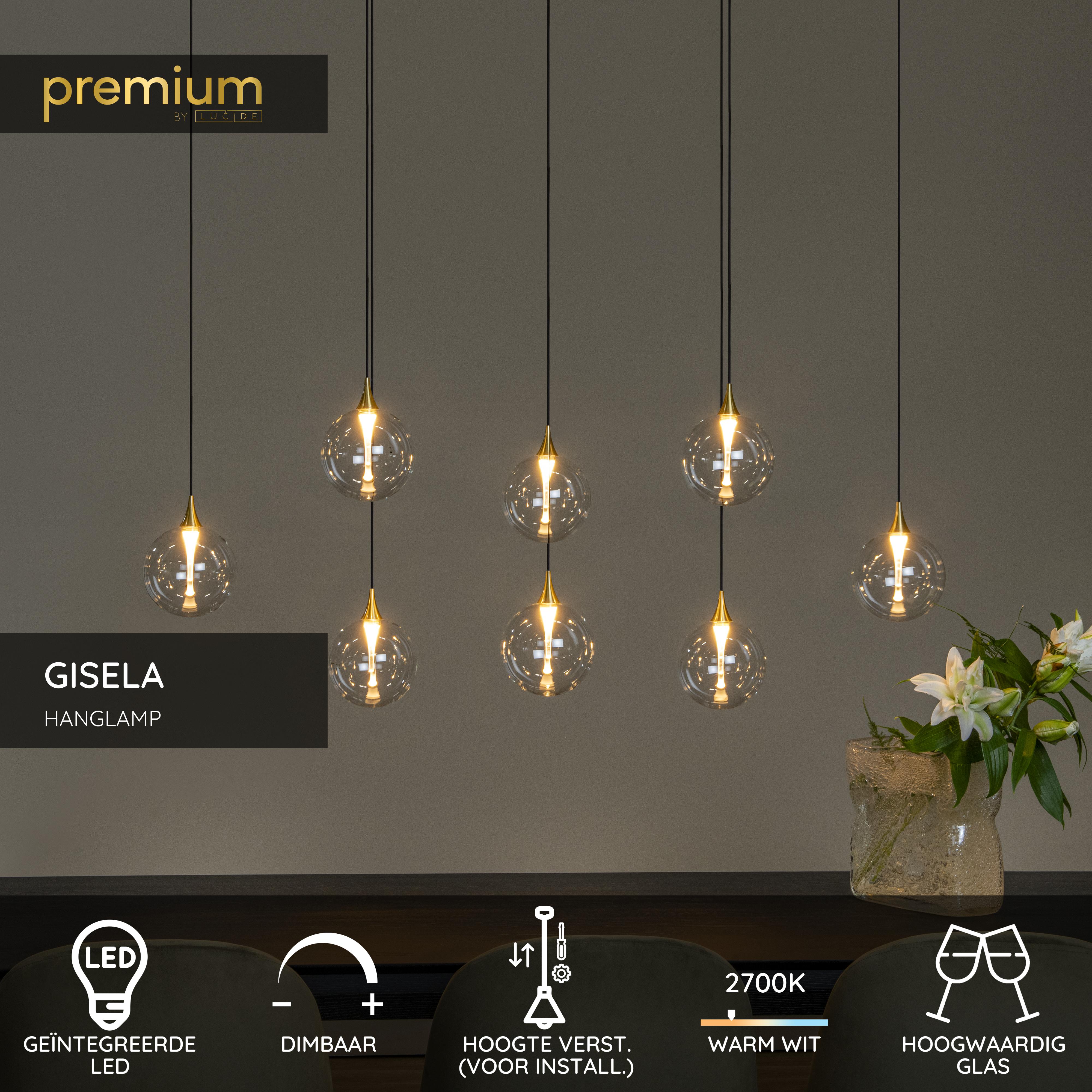 Vind je het soms moeilijk om alle ballen in de lucht te houden? Laat dat maar over aan Gisela, een hanglamp die uit verschillende pendels met heldere, glazen bollen bestaat, die elk verstelbaar zijn in hoogte. De geïntegreerde ledlampen zijn dimbaar en verspreiden een warm wit licht. Dit tijdloze bolvormig ontwerp doet het goed in zowel klassieke interieurs als moderne vormgevingen. Of je ze nu op gelijke hoogte of speels aflopend ophangt: scoren doe je met deze elegante hanglamp altijd.
