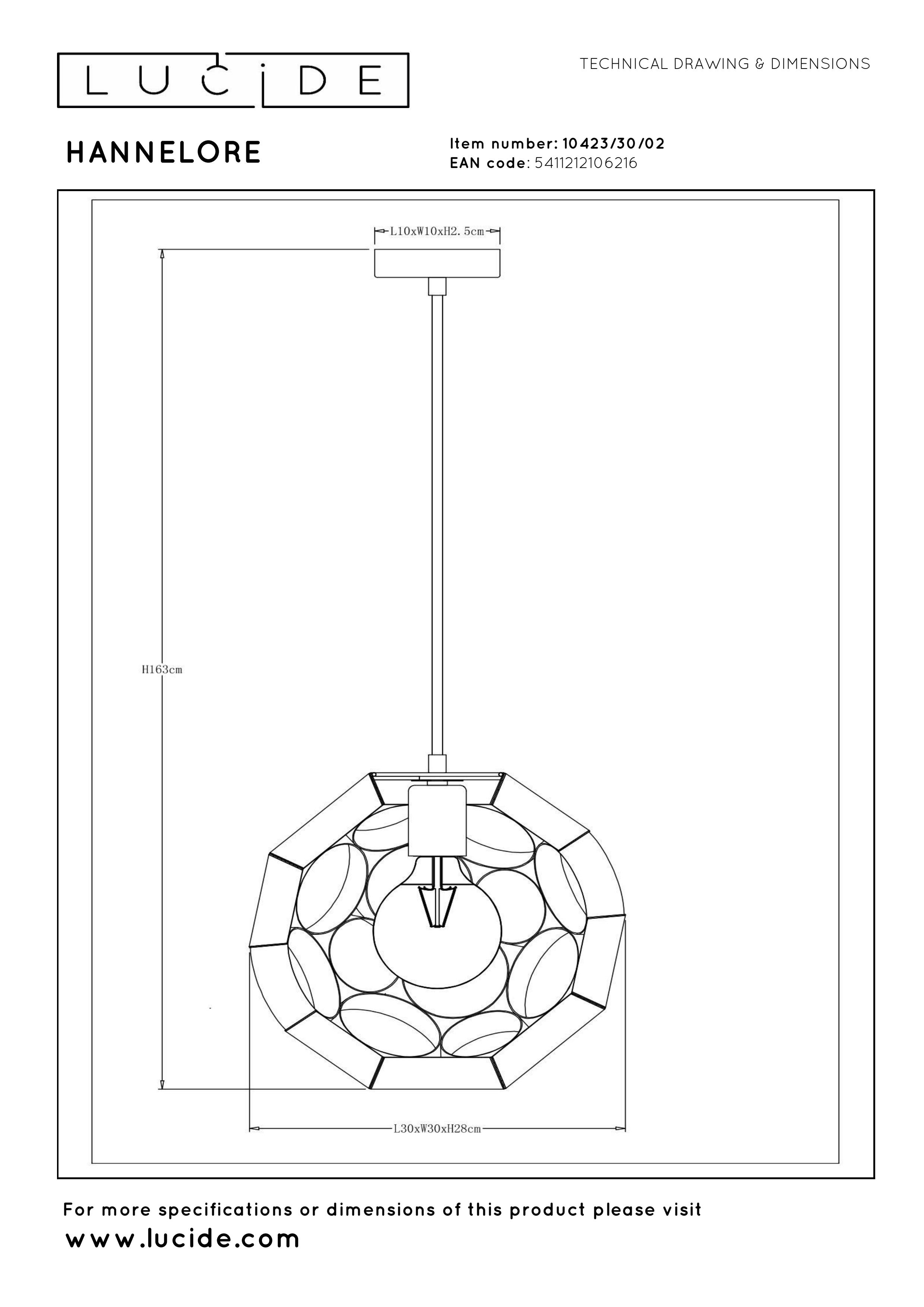 Nostalgisch naar de jaren 60 of op zoek naar het ultieme accessoire voor je woning? Aan creativiteit geen gebrek bij Hannelore. Voor deze bolvormige hanglamp uit metaal draait iedereen zijn hoofd om. De speelse ronde vormen combineren moeiteloos een retro look met moderne uitstraling. Door de open structuur uit metaal komt de lichtbron helemaal tot uiting. Stel de hoogte in tot maximaal 163 centimeter. In een strak-moderne zithoek of in een fluweelzachte leesruimte: deze pendellamp met een diameter van 30 centimeter is van alle markten thuis. Wordt Hannelore jouw eyecatcher in huis?