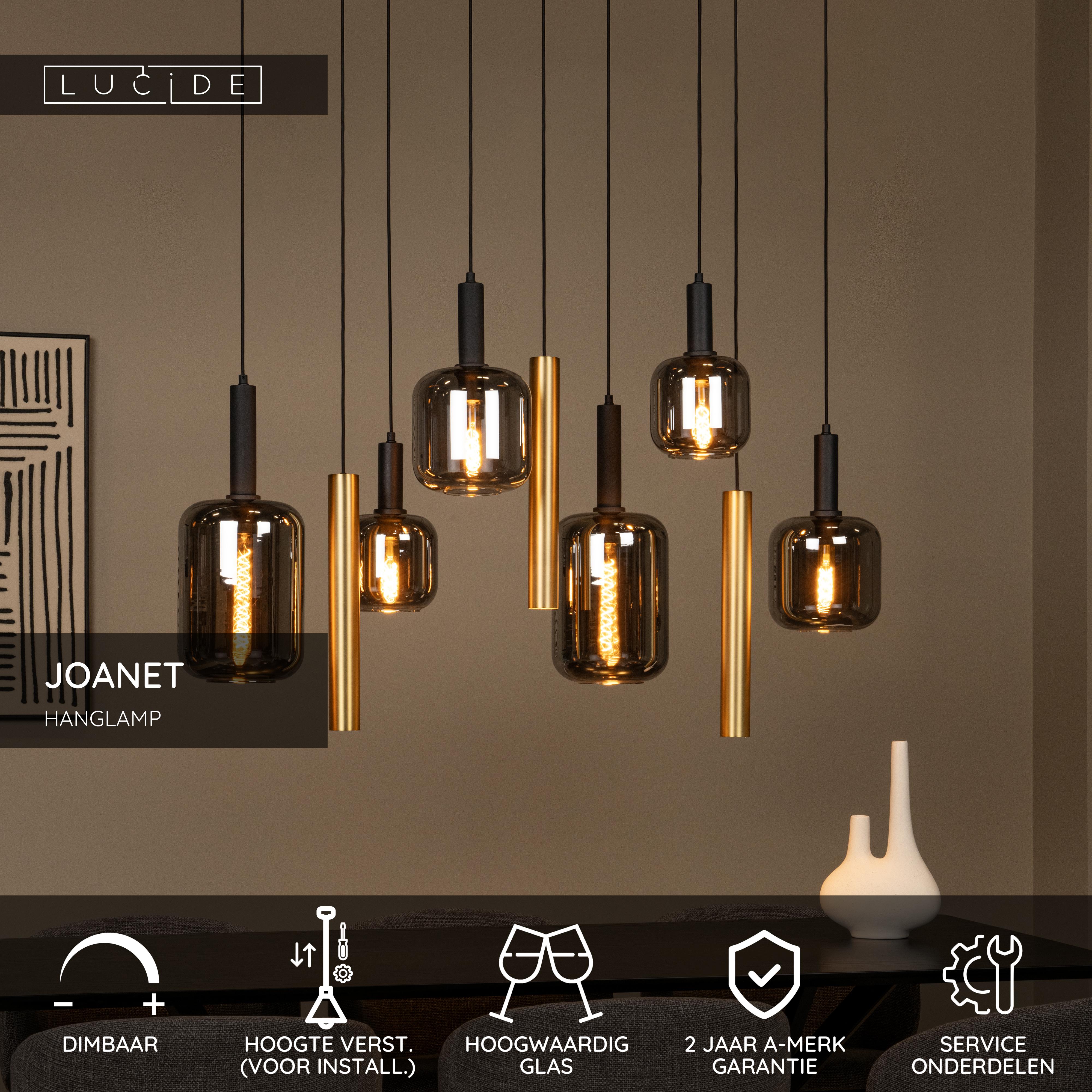 Meer is beter. Toch als het van deze hanglamp, genaamd Joanet, afhangt. Niet één of twee, maar liefst zes lichtpunten bengelen stijlvol naar beneden vanaf de bevestigingsplaat. Omgeven door een elegante glazen huls, met een dialoog tussen heldere en fumé gedeeltes. De afwisselende formaten van het glaswerk brengen dynamiek in het armatuur. Om maximaal van de magie te genieten, kies je voor filamentlampen. Sluit Joanet aan op een dimmer om meteen ook een echte sfeermaker binnen te halen.