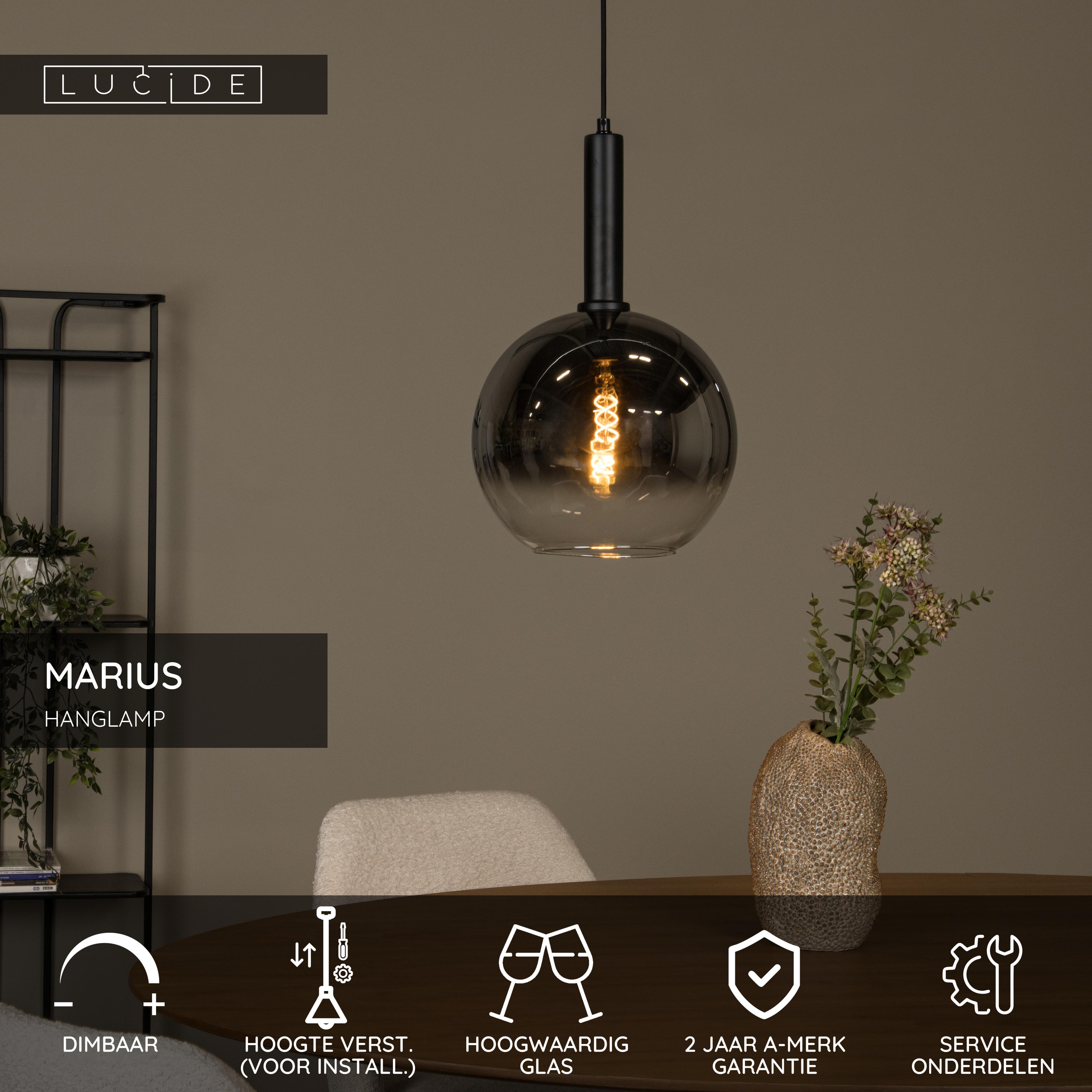 Groots licht verdient de nodige aandacht. En die trekt Marius met alle gemak naar zich toe. Deze luchter uit hoogwaardig glas in fumé uitvoering is de ideale thuis voor een originele ledfilamentlamp. Marius vindt zijn weg naar je woonkamer, eetruimte of salon. Zelfs in de keuken boven je kookeiland voelt hij zich thuis. Het licht zit ingesloten in een bol met 30 centimeter diameter, die languit aan een fijne kabel hangt. Marius sterkt zich uit tot een maximale hoogte van 183 centimeter.