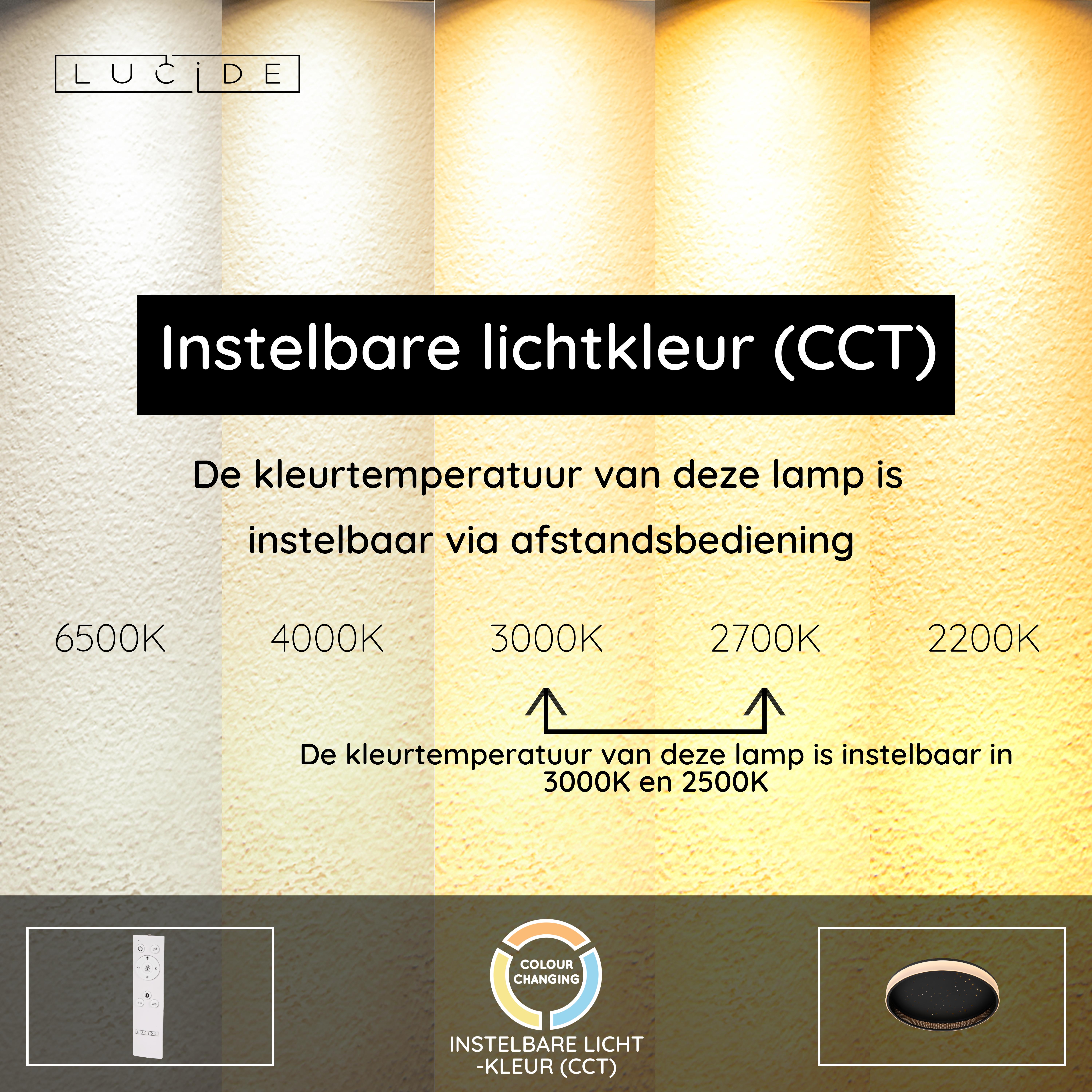 - Kleurtemperatuur instelbaar via afstandsbediening (2500K-3000K)