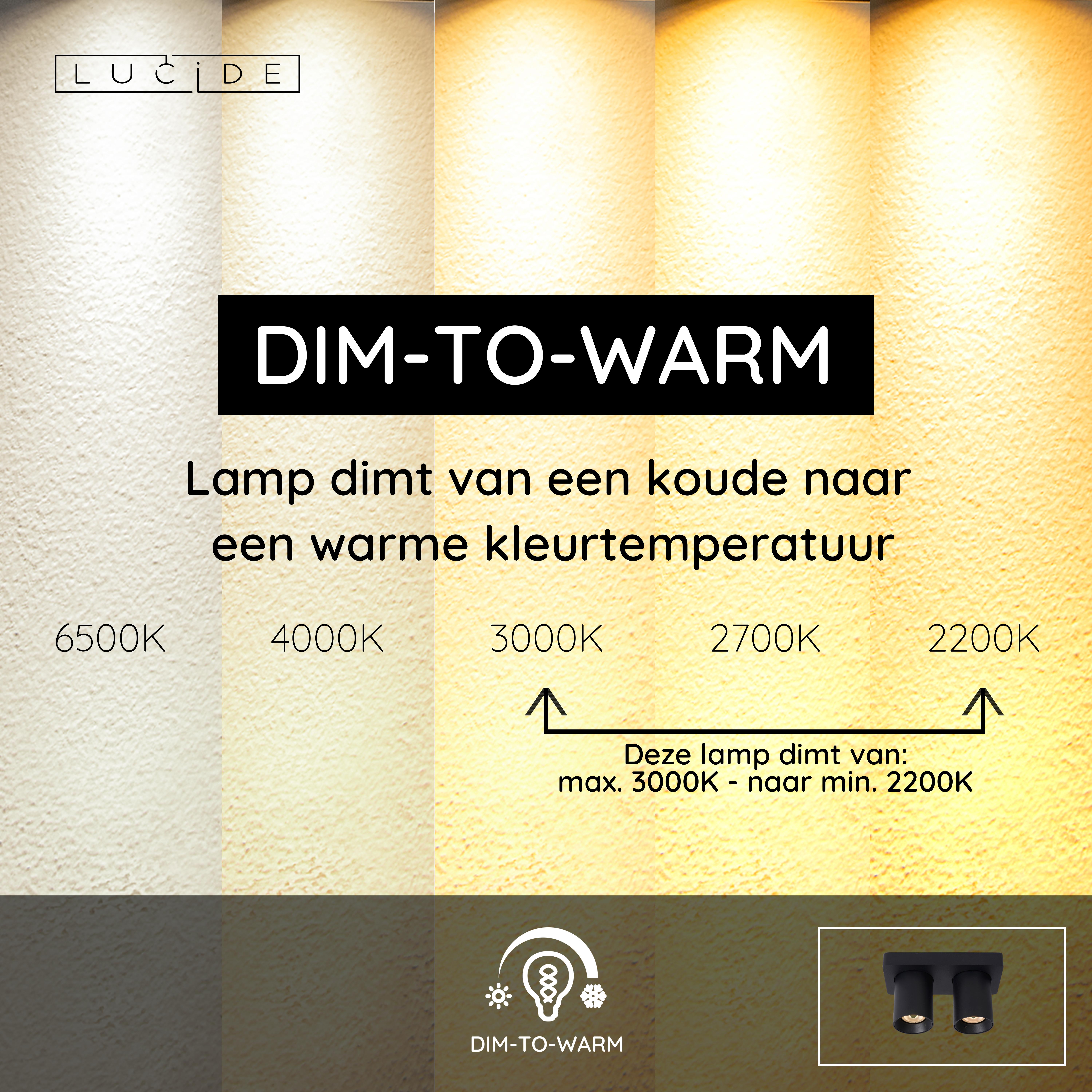 - dim to warm, dimt naar warmere Kleurtemperatuur (2200k-3000k)