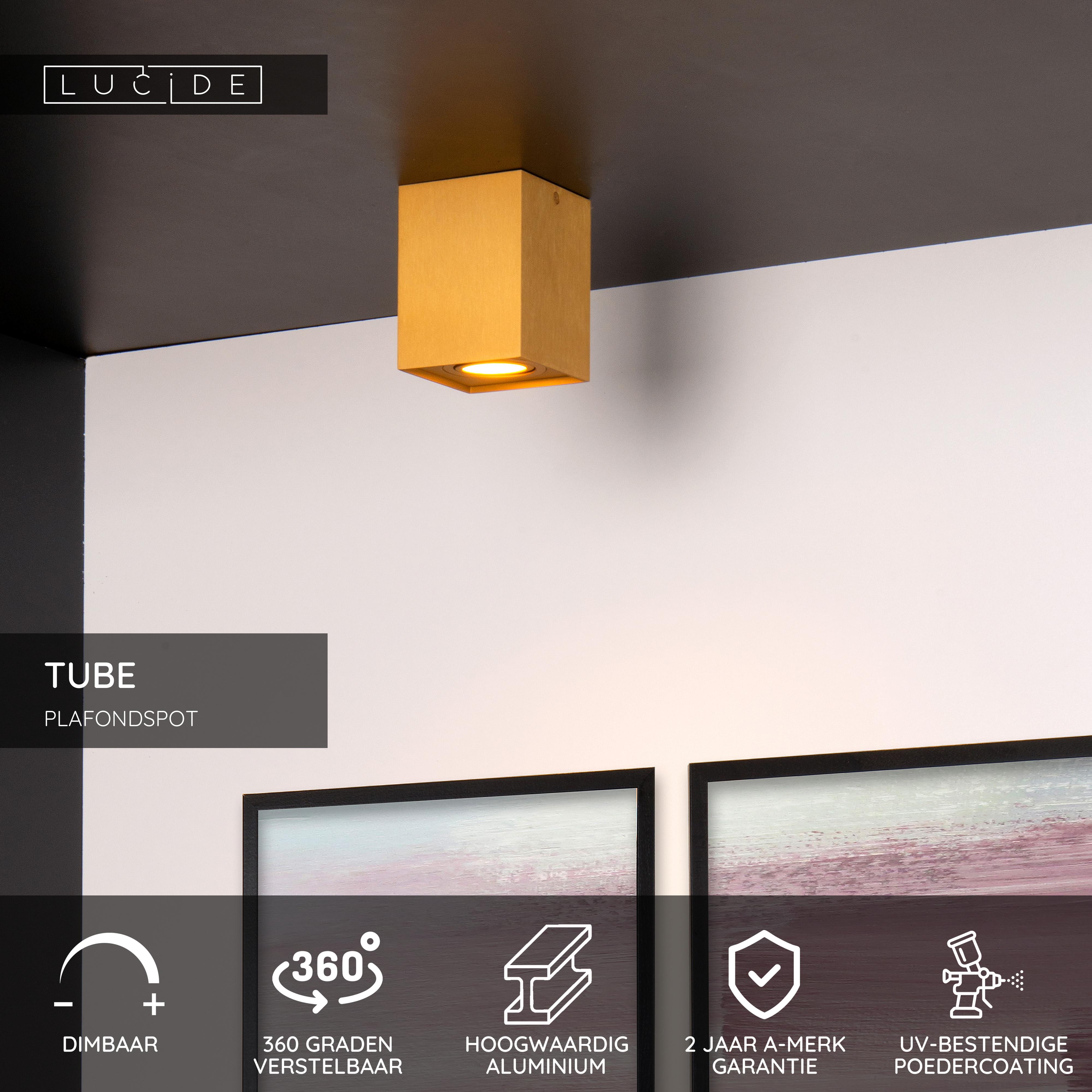 De opbouwspot Tube vierkant van Lucide is een, uit volledig aluminium vervaardigd armatuur en heeft hierdoor een zeer hoogwaardige uitstraling. Met een afmeting van 9.5cm x 9.6cm laat hij zich eenvoudig over een centraaldoos plaatsen. Dit artikel is bij uitstek geschikt als lichtpunt in een kleine hal of toilet. In serie geplaatst is de Tube ook perfect te gebruiken boven bijvoorbeeld een bar of keukenblad. Door zijn 360 graden draaibare en kantelbare spot is de Tube op ieder gewenst punt in de ruimte te richten. De Tube is voorzien van een GU10 hoogvolt fitting en wordt geleverd zonder lichtbron. Aan u de keus om er een mooie al dan niet dimbare GU10 LED spot of een traditionele dimbare GU10 halogeenspot in te gebruiken. De Tube is verkrijgbaar in de kleuren aluminium en wit.