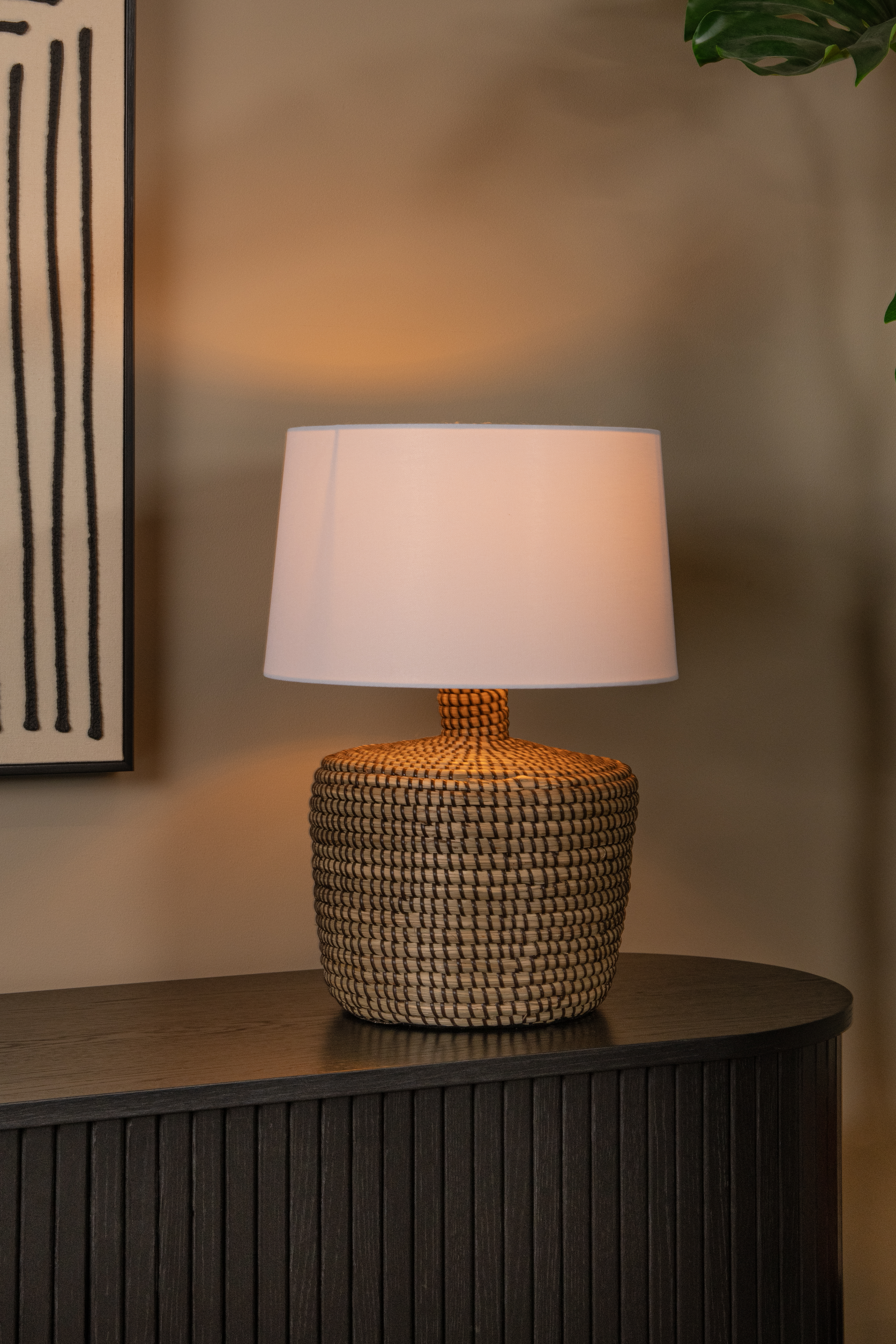 Creëer een warme sfeer in huis met deze duurzame tafellamp. Ambala combineert natuurlijke materialen voor een zachte uitstraling. De linnen ronde lampenkap steunt op een cilindervormige voet in hoogwaardig zeegras. Deze schemerlamp komt prachtig tot haar recht op een commode, op een bijzettafel of op een salontafel in een knusse leeshoek. Combineer Ambala met verfijnde accessoires in rustige tinten voor een Scandinavische totaallook. De tafellamp is 48 centimeter hoog en 35 centimeter breed, en heeft een handige schakelaar op het snoer.
