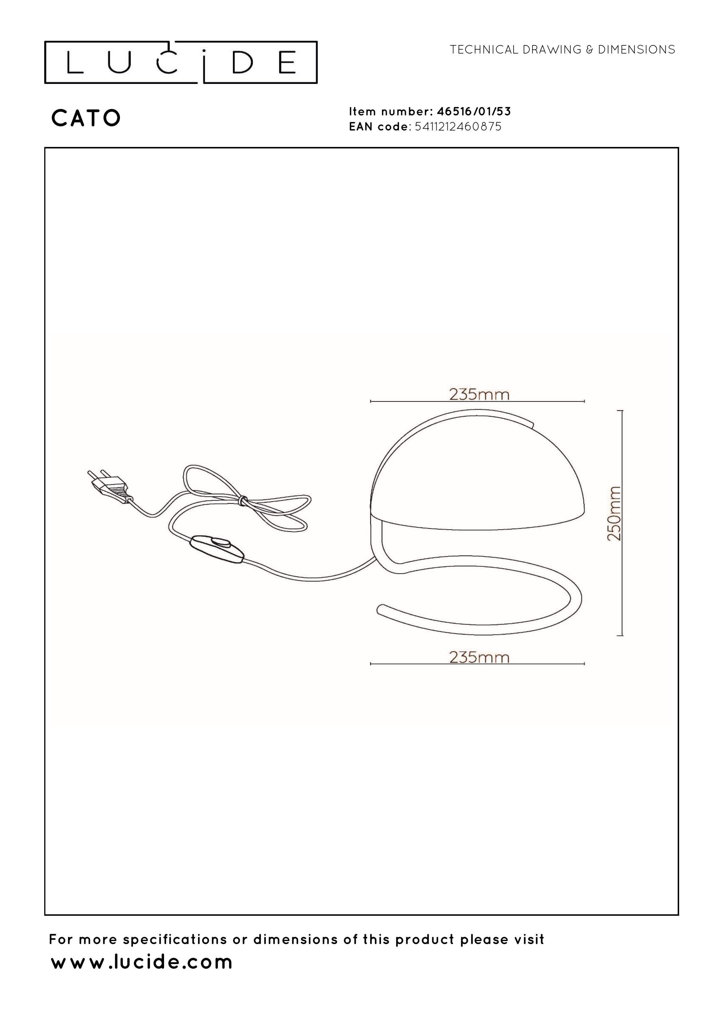 Cato is een schattige tafellamp doordrongen van een retrodesign. Met een compacte diameter van iets meer dan 23 centimeter en een hoogte van 25 centimeter vindt hij in ieder hoekje van het huis wel een plaats. Misschien doet deze lamp je wel aan een kleurrijke paddenstoel denken? Dat kan, maar dan wel eentje met een halfronde lampenkap gemaakt uit hoogwaardig mat glas en een elegante voet uit metaal. Bovendien schakel je Cato eenvoudig aan en uit via de schakelaar in het snoer.