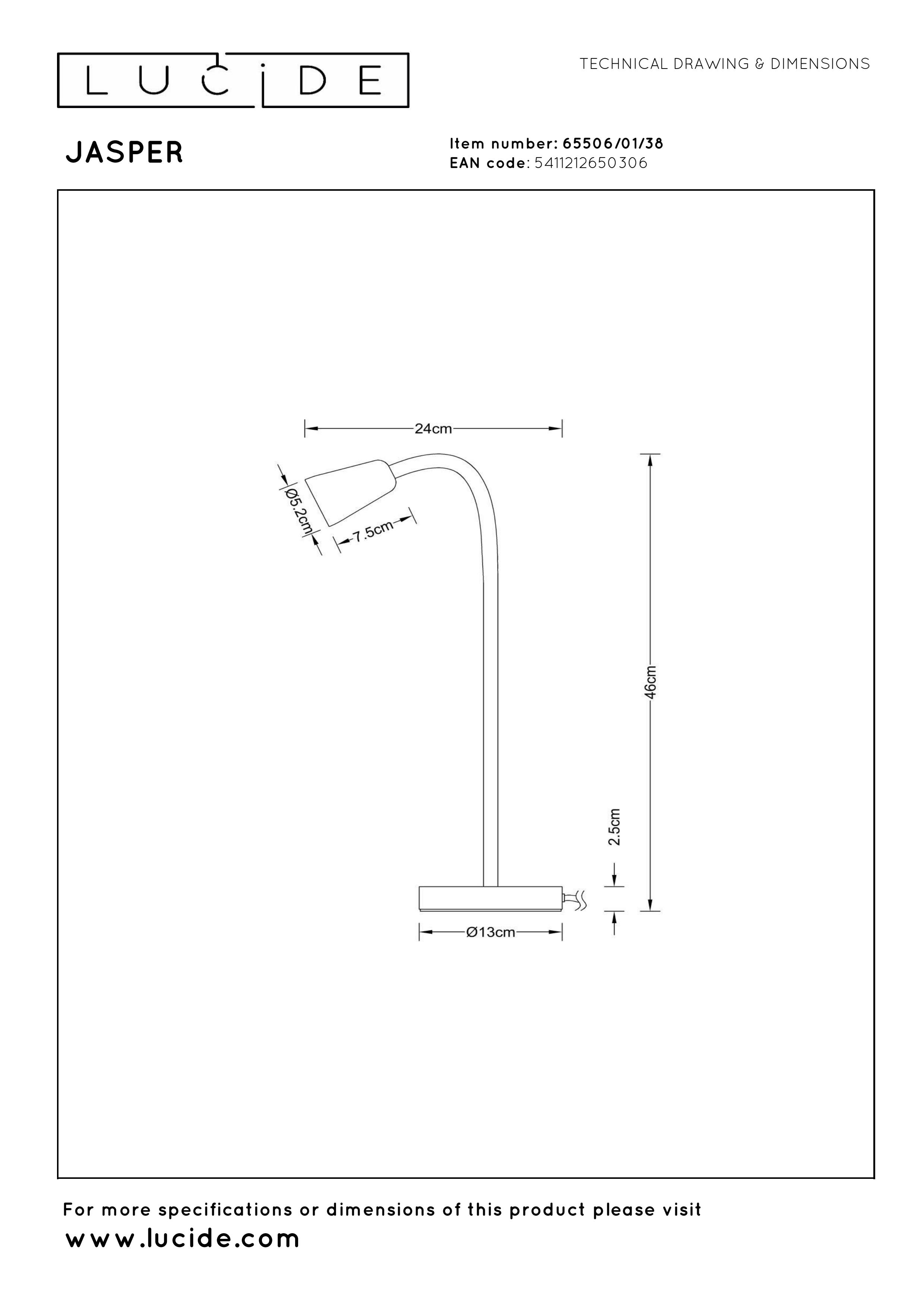 Zoek je een compacte bureaulamp die zowel functioneel als stijlvol is? JASPER is uitgerust met een flexibele leesarm waarmee je het licht perfect kunt richten op wat belangrijk is. Ideaal voor thuiswerken, lezen of studeren. De tafellamp is vervaardigd uit metaal, voorzien van een aan/uit-schakelaar op het snoer en geschikt voor een GU10 LED-lichtbron van 25W (niet inbegrepen). Met een breedte van 13 cm, een diepte van 24 cm en een hoogte van 46 cm past JASPER moeiteloos op elk bureau of nachtkastje. Voeg praktische verlichting toe aan je ruimte en bestel JASPER vandaag nog.