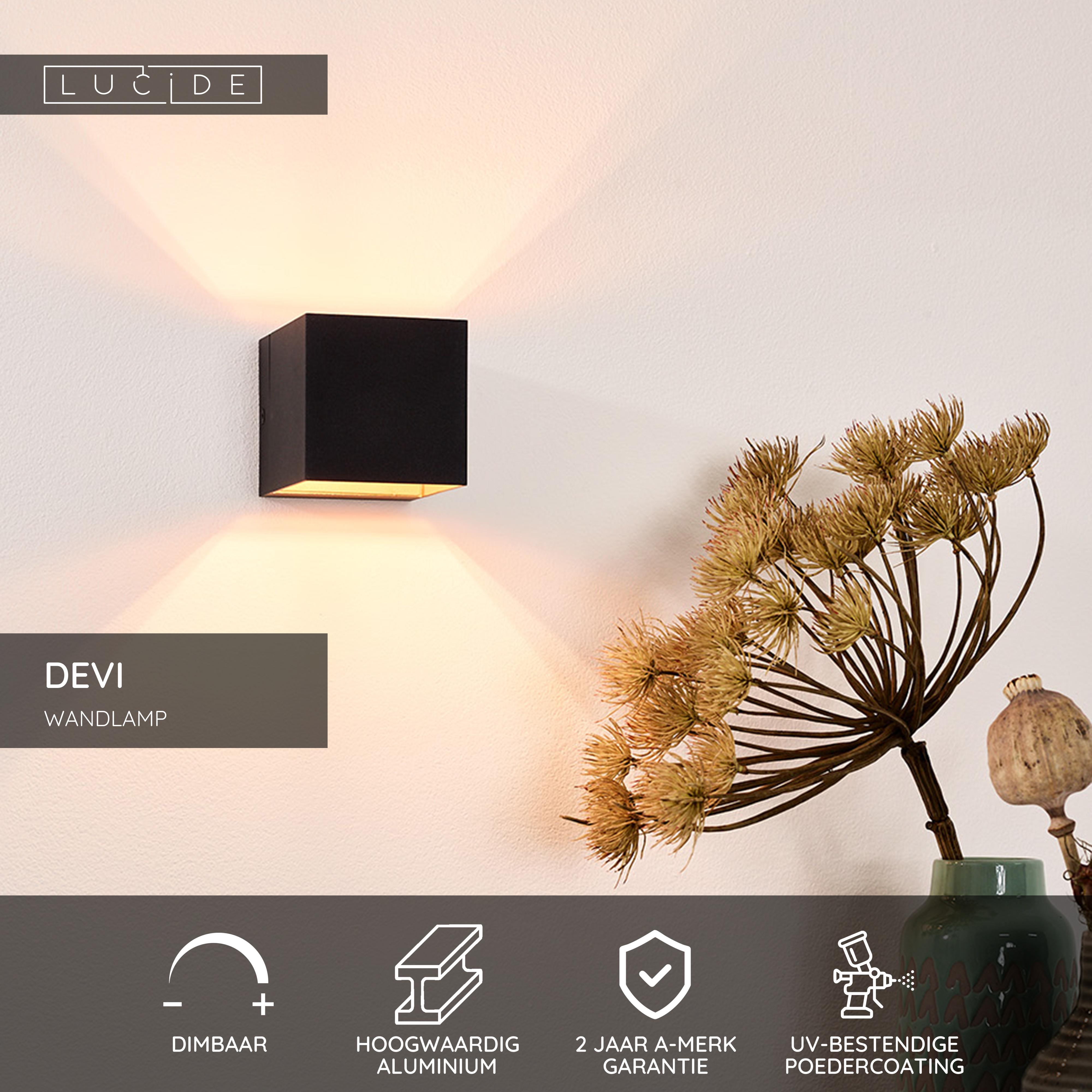 De wandlamp Lucide Devi is een schitterend afgewerkt aluminium armatuur. Deze veel door architecten toegepaste wandlamp komt het best tot zijn recht op een mooie stuc wand of een stoere grof gemetselde muur. Deze wandlamp geeft namelijk een prachtige zandlopervormige lichtbundel. Met een achterplaat afmeting van 10,5cm x 8cm laat de Devi zich eenvoudig over een centraaldoos plaatsen. De Devi is uitgevoerd met een G9 hoogvolt fitting maar wordt zonder lichtbron geleverd. Kies zelf voor een traditionele G9 halogeenspot (max 42W) of een energiebesparende al dan niet dimbare G9 LED lichtbron. LED of traditioneel halogeen, doordat er geen transformator in de Devi zit is dit armatuur zeker zeer eenvoudig dimbaar (met een basic in of opbouw dimmer - niet inbegrepen). De Devi is beschikbaar in de kleuren zwart met binnenzijden mat goudkleurig, wit en aluminium.