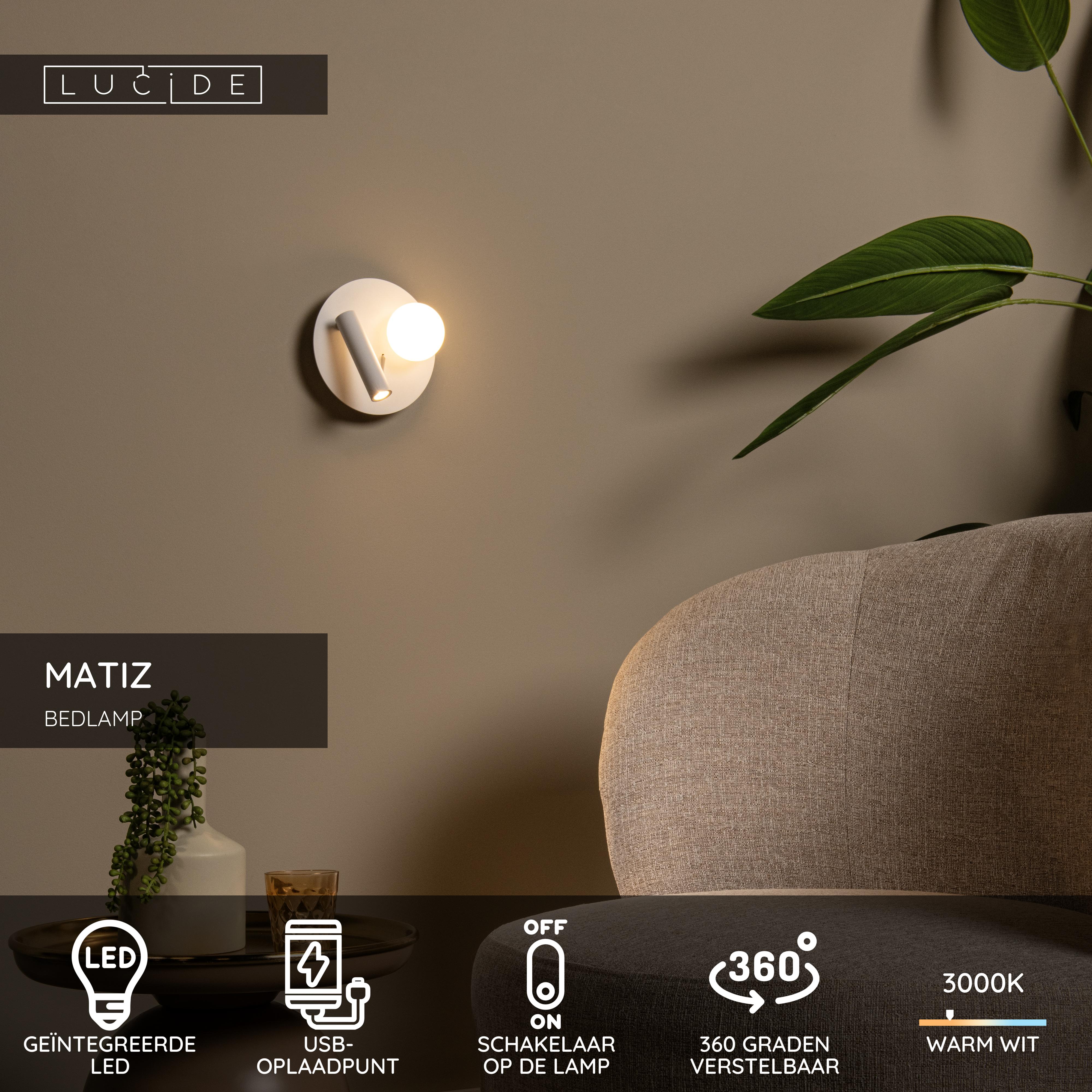 Lucide MATIZ - Bedlamp / Wandlamp - Ø 16,5 cm - LED - 3000K - Met USB oplaadpunt - Wit