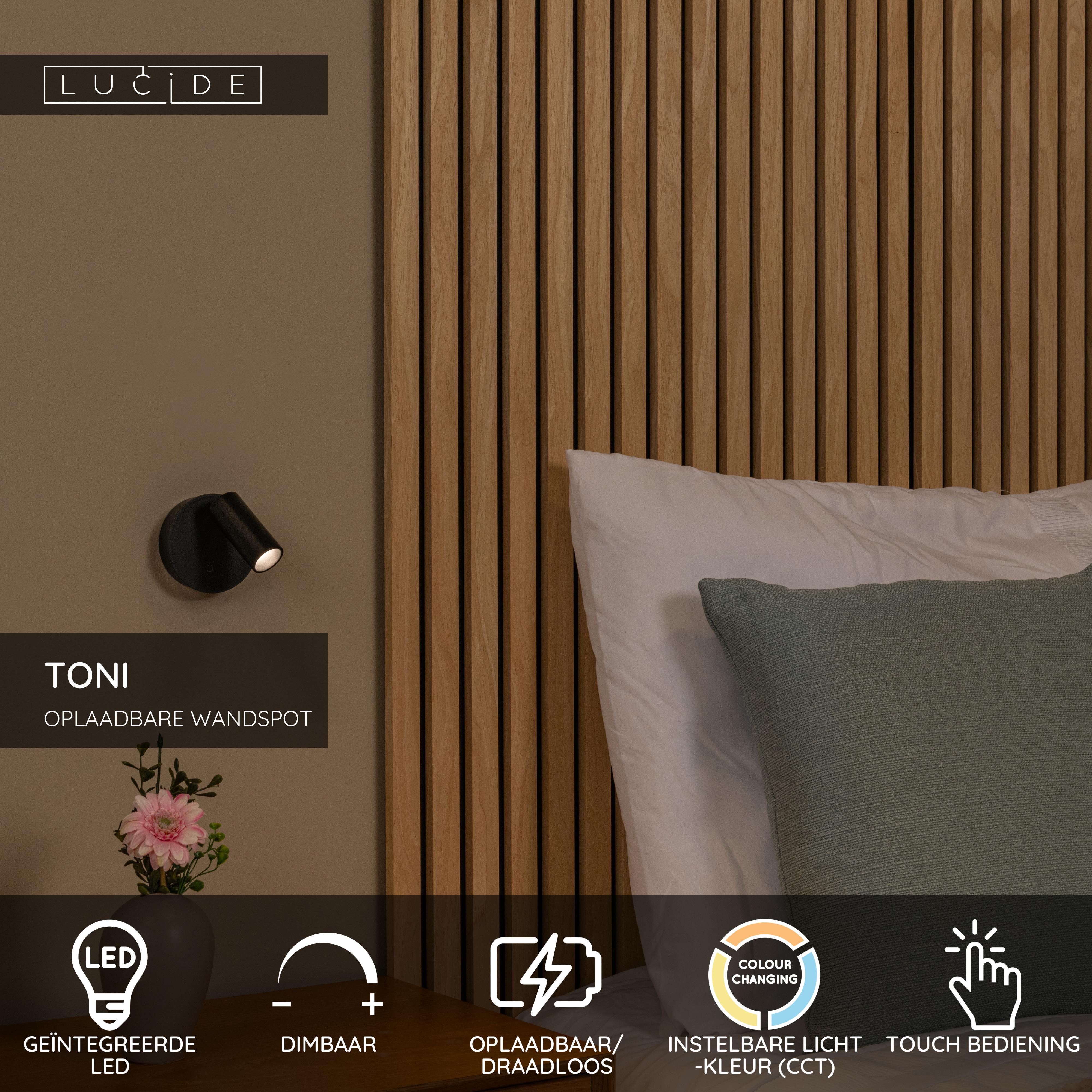 Lucide TONI - Oplaadbare Wandspot / Wandlamp - Accu/Batterij - Ø 8,1 cm - LED Dimb. - CCT - 1x2W 2700K/4000K - Magnetisch - Zwart