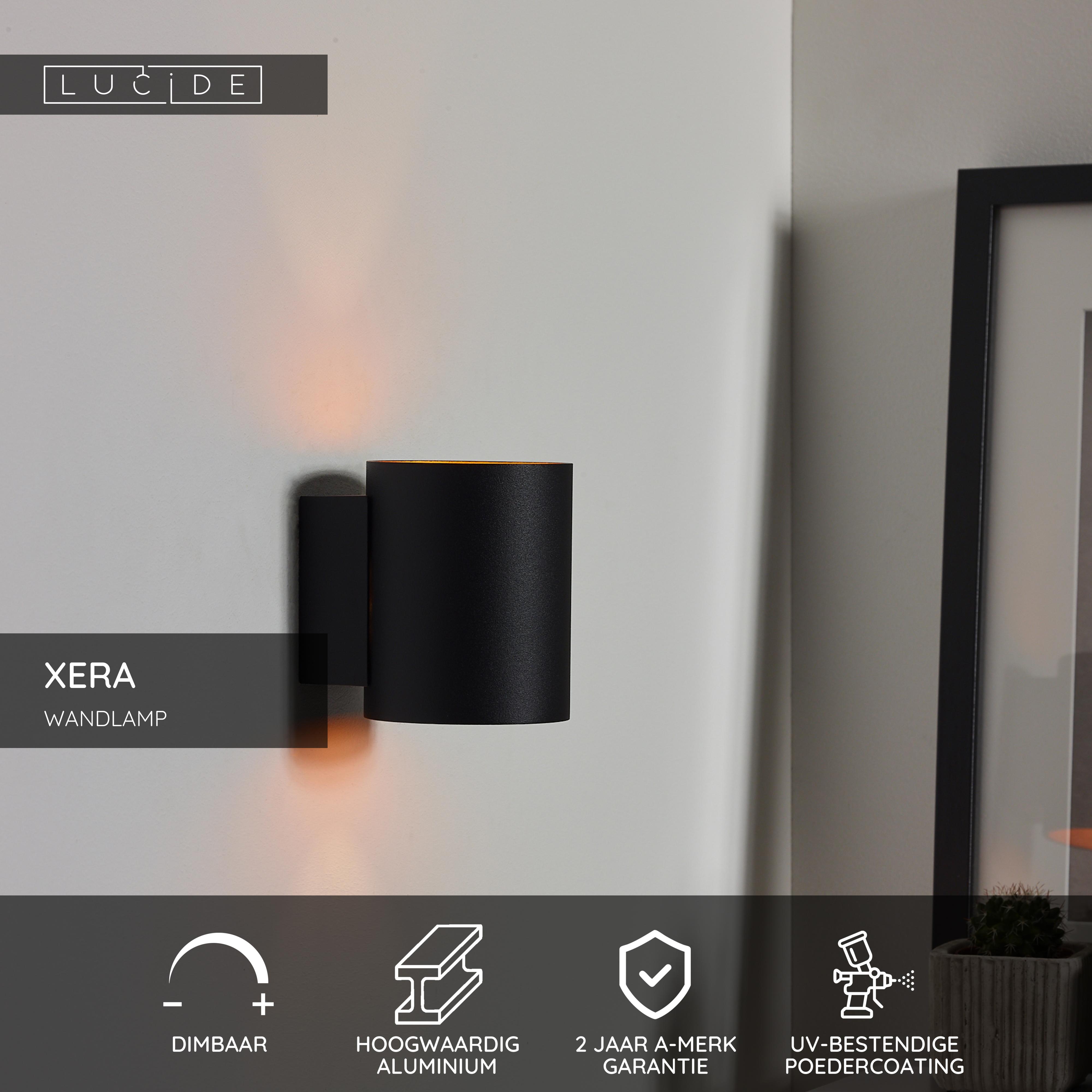 Wandlamp Xera is met haar afmeting van 8 op 10 centimer niet de grootste, maar dankzij het unieke design is ze niettemin een eyecatcher in elk modern interieur. De dubbele lichtspreiding in de kokervorm zorgt voor een uniek effect op een bakstenen, betonnen of geschilderde muur. Met haar zwarte kleur geeft Xera jouw woonkamer, kantoor of hal een subtiel industrieel tintje. De binnenkant van deze lamp is goudkleurig, wat een extra warm effect creëert.
